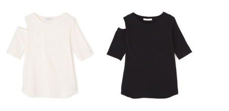 肌が覗くアシンメトリーな肩あきデザインがモード感漂うカットトップス。
